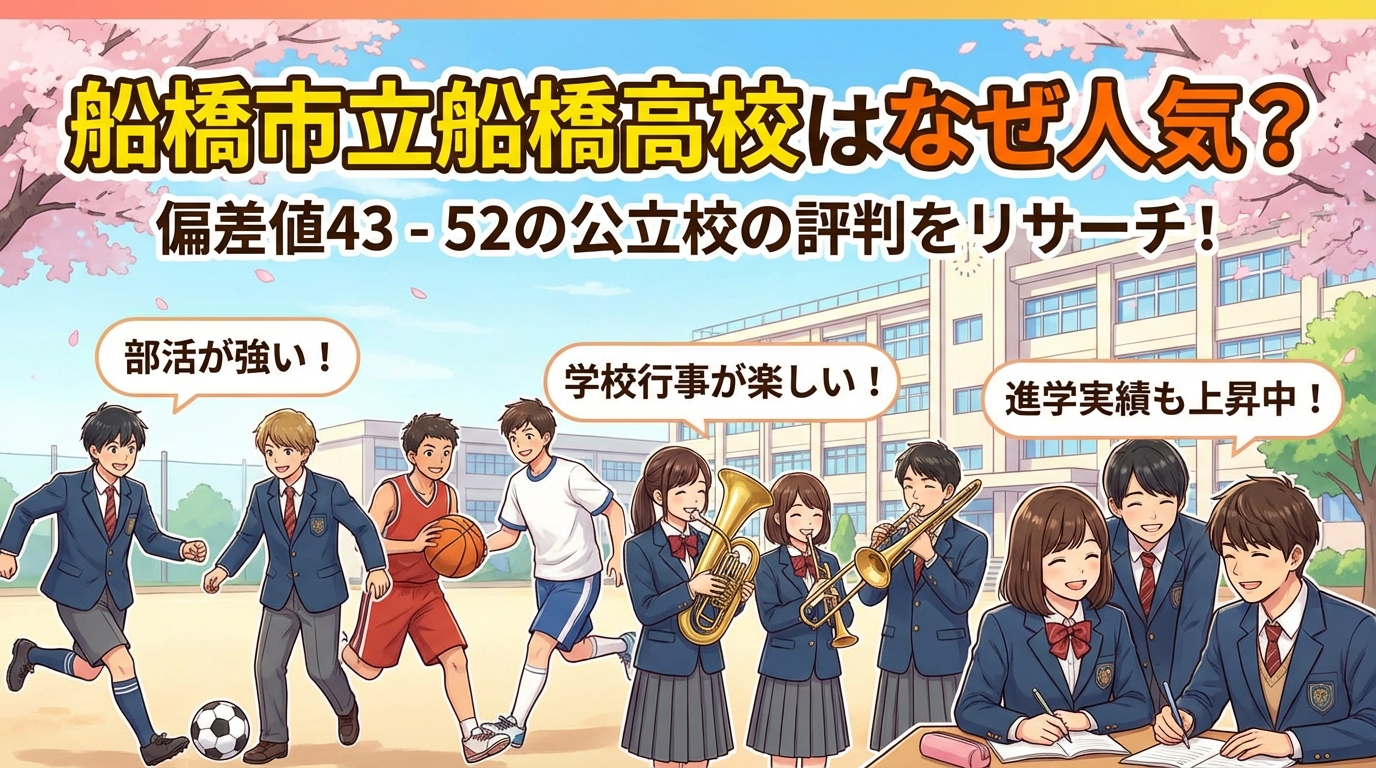 この記事では、市立船橋の基本情報から偏差値・入試情報、充実した部活動の実態、そして気になる進路実績まで徹底解説します。アクセス良好な東船橋駅周辺の環境や、国際教養コースなど特色あるカリキュラムについても詳しくご紹介しますので、学校選びの判断材料としてお役立てください。